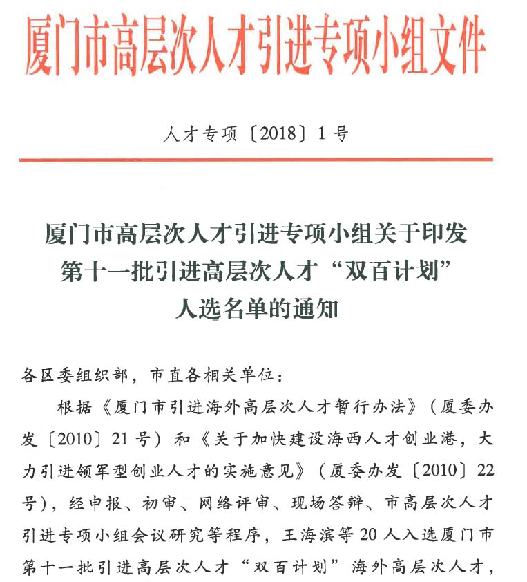 历经半年时间申报、初审、网络评审、现场答辩、市高层次人才引进专项小组会议研究和公示等层层筛选,我司与厦门大学合作的项目喜获2018年厦门市第十一批“双百计划”领军型创业人才称号。近年来,厦门市始终把人才作为引领发展的第一资源,通过大力实施人才强市战略,深入推进人才发展体制机制改革,努力为全市高质量发展夯实人才基石。全市高层次人才规模一年上一个新台阶。据不完全统计,厦门市目前有国家级人才接近1200人,省级人才约2200人,市级人才计划累计支持23300余人,“双百计划”已评选出十一批1010人,实际在厦门落地的人才创办的企业585家,主要集中在软件信息、生物医药、集成电路等全市“千亿元产业链”领域。我司凭借“基于MEMS技术的无线无源物联网传感器芯片开发及应用”项目,得到评审专家的一致认可和好评。