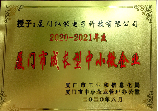 2020年8月厦门纵能电子科技有限公司荣获厦门市工业和信息化局及厦门市中小企业管理办公室授予的2020-2021年度“厦门市成长型中小微企业”荣誉称号,并颁发奖牌。