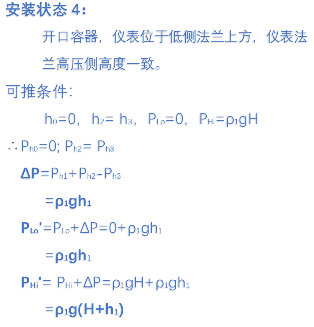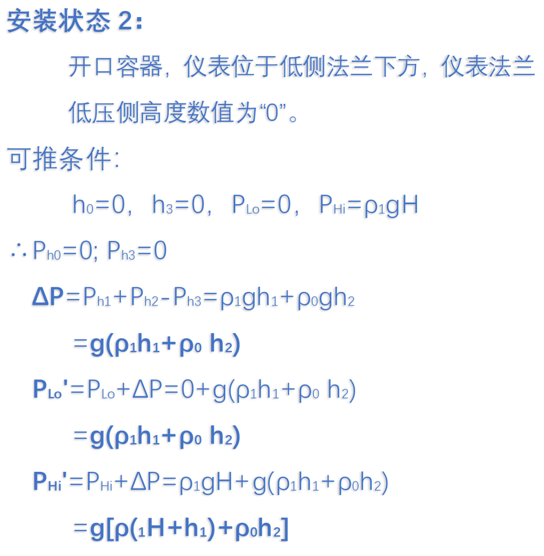 同时也可以看出在密闭容器的测量中,双法兰液位计的仪表表头位置并不影响迁移量的计算,因此可以安装在任意位置,但也需要确保液位计表头在容器高低两个法兰中间位置时,需要保证Ph1≥Ph2,避免影响正确的测量范围。