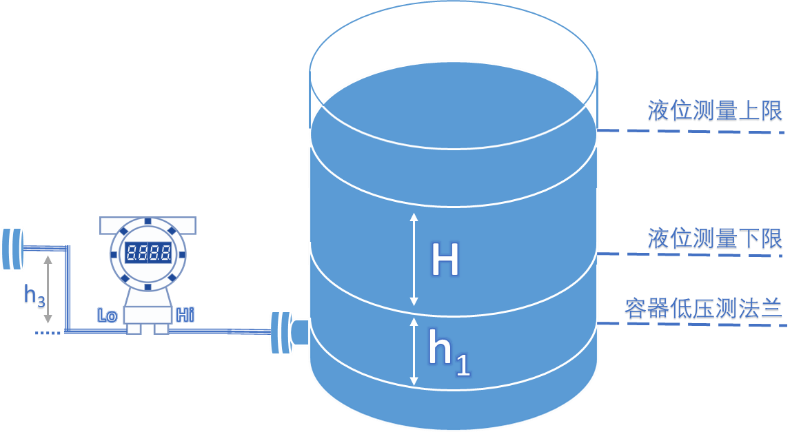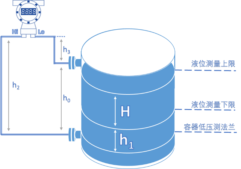 容器高侧法兰中心线到仪表低压侧膜片垂直高度:h3=h0+h2