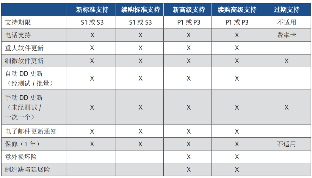 客户可以选择购买三年标准支持,这将为客户提供GSC电话支持、固件更新以及自动DD更新。请注意,额外的标准支持不会延长硬件保修。