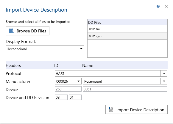 注意:手动添加DD文件是选择More更多/Import Device Description导入设备描述文件,需要同时选中fm8和sym扩展名的文件,所有需要填写的部分必须按照如上填写,否则仪表无法识别,然后再选择导入后并安装。