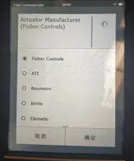 8、到下一菜单选择执行器品牌,选择Fisher controls费希尔控制,点确定到下一菜单,选择执行器的型号,点确定按钮。