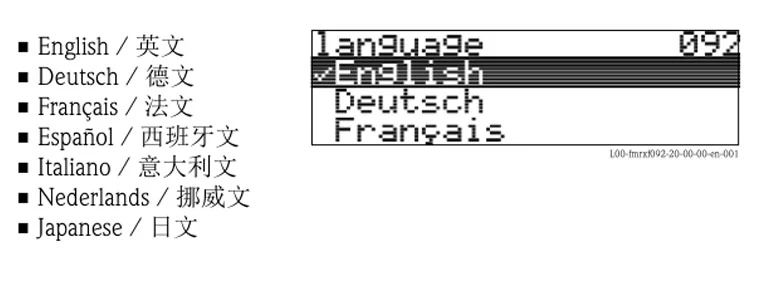 tip 设备首次上电时,要求选择文本的显示语言,提供以下显示语言: