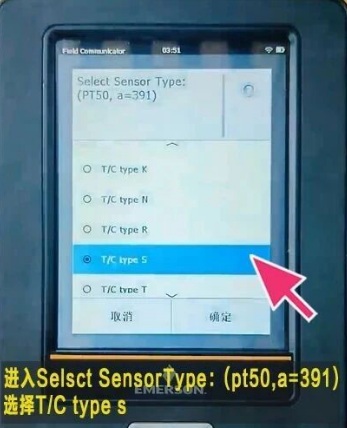 进入Selsct Sensor Type:(pt50,a=391) 在分度类型列表上-->选择T/C type s 确定
